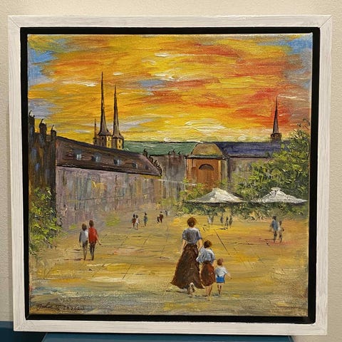 Et mere dramatisk og farvemættet indtryk, hvor domkirkens spir står skarpt mod en mørkere, næsten natteblå himmel. Byens felter i gult, rødt, hvidt og blåt lyser op som reflekterede aftenlys, og kontrasterne skaber dybde og stemning. Maleriet har et markant, vibrerende aftenskær.