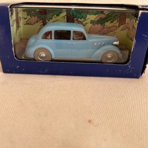 En voiture La FORD 1a Lincoln Torpedo Le Cygne du Pharaon 1935 model bil i blå farve med to figurer. Skala 1:43. Samlerobjekt i original emballage.