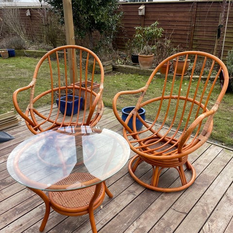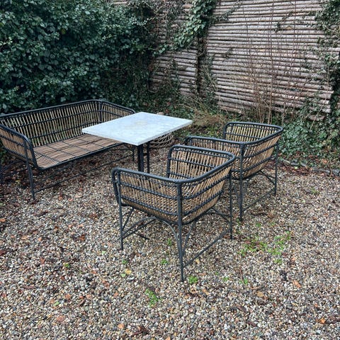 Rattan havemøbelsæt bestående af en stol, en gyngestol med fodskammel, en sofa, og et rundt bord med marmorplade. Møblerne har polstrede puder med mønster i lyse farver. Sættet er velegnet til brug i en udestue.
