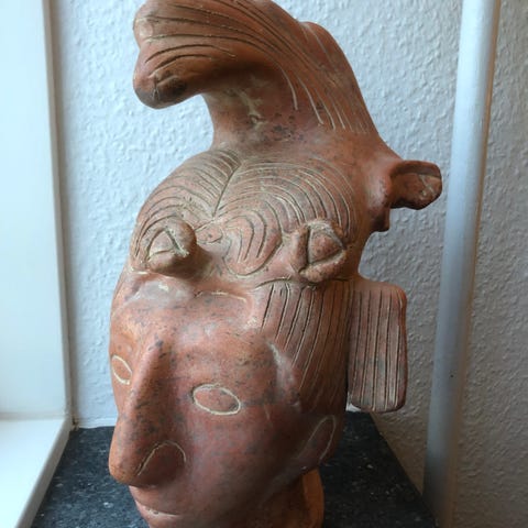 Peruviansk mytisk tohovedet lama keramikfigur, skulptur lavet af terrakotta. Skulpturen har en rødbrun farve med sorte dekorative mønstre. Den er håndlavet, i pæn og intakt stand H 15,5 L 15