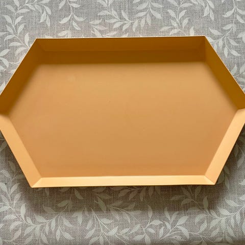 Hay sekskantet bakke i rød plast. Bakken har en geometrisk form og er velegnet til opbevaring eller dekoration. Materialet er holdbart og let at rengøre.