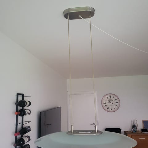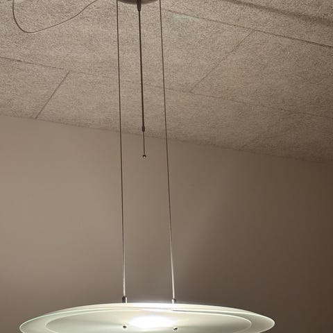 Rigtig flot stand med fejlfrie glasskærme og almindelige aldersbetingede brugsspor på stål og wire. Udført i matteret glas og børstet stål.