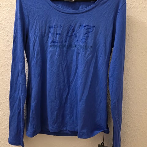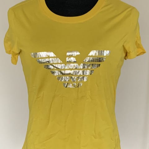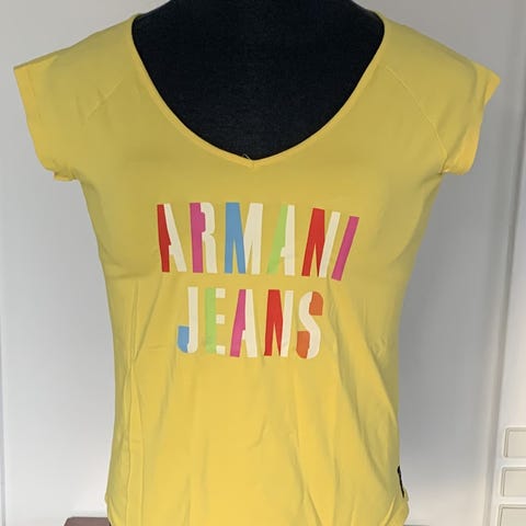 Armani bluse eller T-shirt i chokoladebrun farve. Der står størrelse 46 i blusen, men det er en italiensk størrelse. Jeg har vurderet størrelsen til L ud fra et brystmål på cirka 90 cm og en længde på cirka 54 cm. Blusen er fremstillet af 95% viskose og 5% elastan.