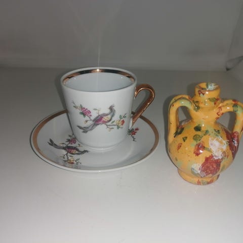 Kahla retro kop til børn fra slutningen af 70'erne eller starten af 80'erne. Porcelænskop produceret af Kahla i det daværende Østtyskland. Motivet er hentet fra det engelske børnerim "Little Miss Muffet". Koppen rummer cirka 1,5 dl og er godt brugt med brugsspor både udvendigt og indvendigt - se billeder.