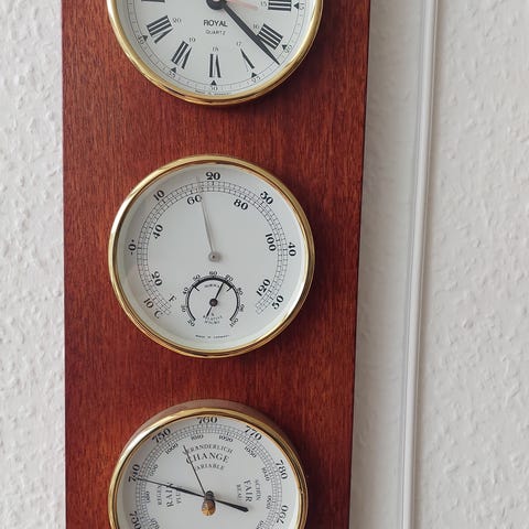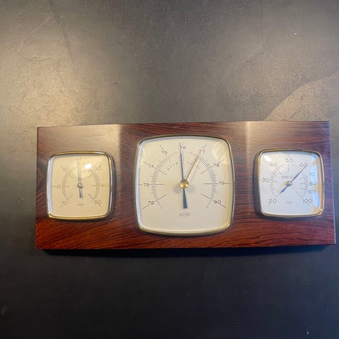 Flot vejrstation i palisandertræ. Med termometer, barometer og hygrometer.