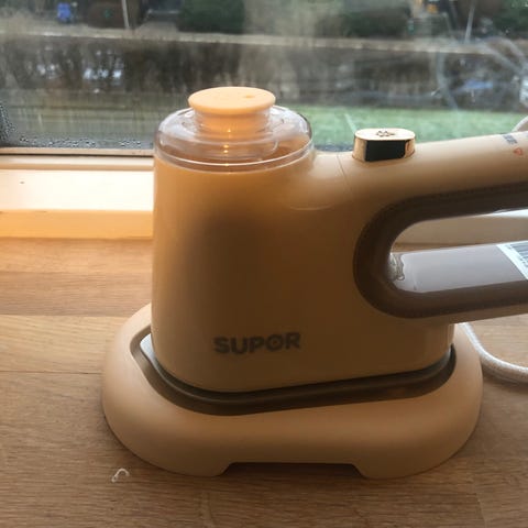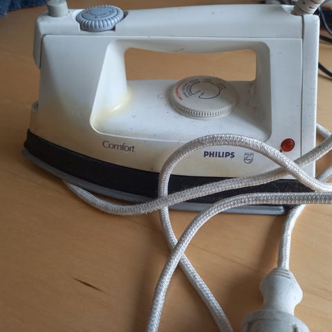 Ide Line Classic 16-16 strygejern i hvid og blå farve. Udstyret med temperaturregulering, dampfunktion og en metalstrygeplade med huller til damp. Strømforsyning via ledning. Velegnet til rejser.