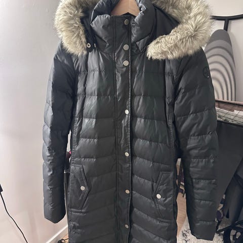 Tommy Hilfiger Vinterjakke i sort farve til kvinder. Størrlesen siger L, men den passer en M, da den er lille i størrelsen.