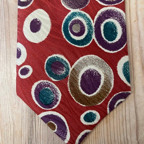 Van Gils herre slips i blå farve med mønster bestående af gule og røde prikker. 100% silke. Bredeste sted: 9,5 cm.