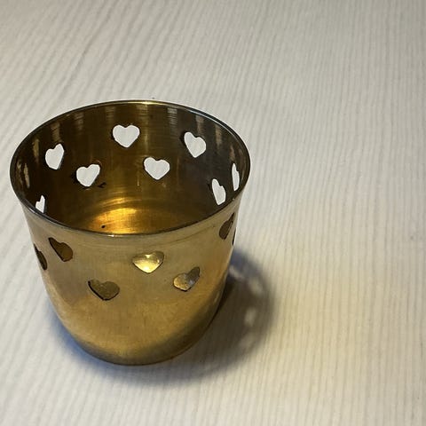 2 messingbægre med fine udstansninger. Velegnet til at sætte et fyrfadslys i, som så stråler ud gennem de små huller. De er ca. 7 cm i diameter og ca. 6,5 cm høje.
