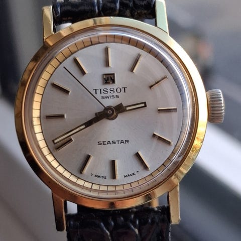 Sælges fra min samling. Flot dress ur fra Tissot Visodate Seastar Seven med manuelt optræk. Uret måler 32 mm målt uden kronen. Skiven er rigtig flot. Mont med en ny rødbrun læderrem. Uret er ikke servicetrængende og holder tiden perfekt.