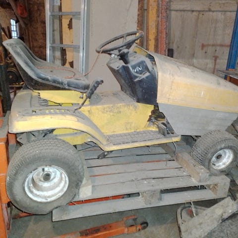 John Deere plænetraktor udstyret med motor og batteri. Maskinen har en gul karrosseri og sort sæde. Motoren er synlig med røde og sorte komponenter, og batteriet er placeret foran sædet. Egnet til græsslåning i private haver eller mindre græsarealer.