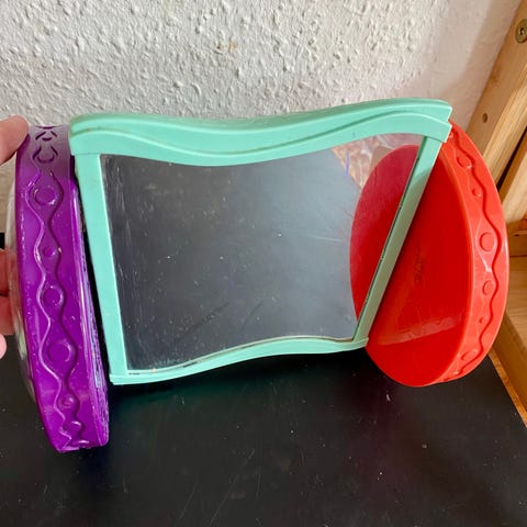 Hasbro Playskool Børnespejl med integrerede legetøjsfigurer i blå og pink, lavet af plast. Spejlet er designet til børn og kan monteres på væggen. Det har farverige perler til leg og sensorisk stimulering.