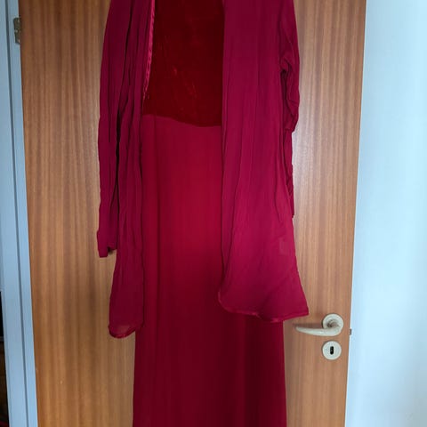 Billede 3+4: Rød festkjole, brugt 2 gange, nyrenset. Mrk.: Comme Ca France Pepino, str. 12.