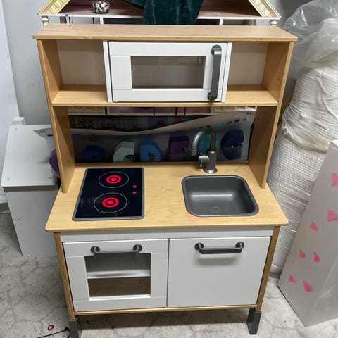IKEA børnekøkken i træ med vask og komfur. Køkkenet har to skabe med døre, en vask med armatur og et komfur med to kogeplader. Køkkenet er designet til børn og egnet til leg og læring.