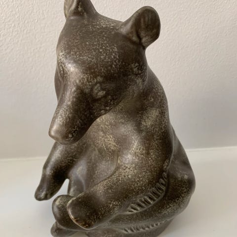 Siddende bjørn fra Johgus. Fremstillet i 1950'erne. Højde ca. 23 cm. Uden skår, afslag eller revner.