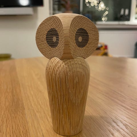 Fineste ugle i træ på juta snor. Mål på foto.