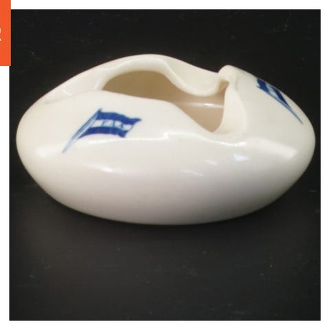 Askebæger med motiv af en kirke og mennesker i snevejr. Mål: 15 X 10,5 cm.