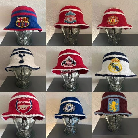 Hæklede bøllehatte til alle Superliga-klubber efter egen opskrift og design. Fast pris kr. 300.