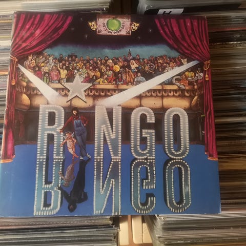 Ringo Starr Ringo vinylplade med cover, indeholder musiksamling fra kunstneren Ringo Starr. Pladen er i standard størrelse og har et farverigt cover med billede af en scene og publikum.