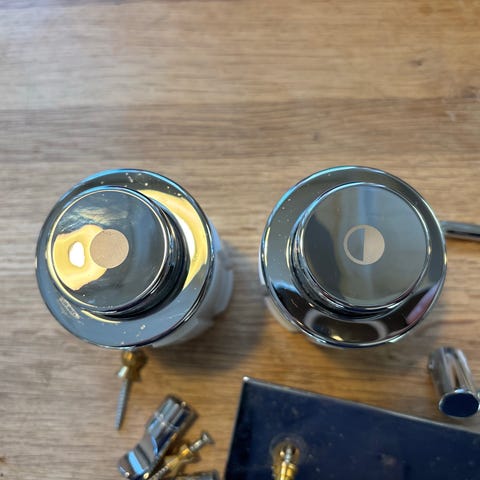 Vola A85-64 kobber cisternebetjening. Dobbelt skyl. Produktet er dansk design. til installation på væg.