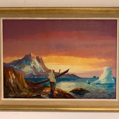 Oliemaleri på lærred, Arne Brendt (1924-2014), stil: Naturalistisk Maleri med motiv fra Grønland. Person med kajak, fra omkring 1960