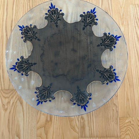 Stort og fejlfrit glas fad i flot grønlig farve med små jeg kalder dem fabeldyr (mønster )