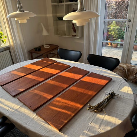 To teak hylder med brugsspor fra hyldeknægte, lige blevet plejet med et nyt lag træ olie.