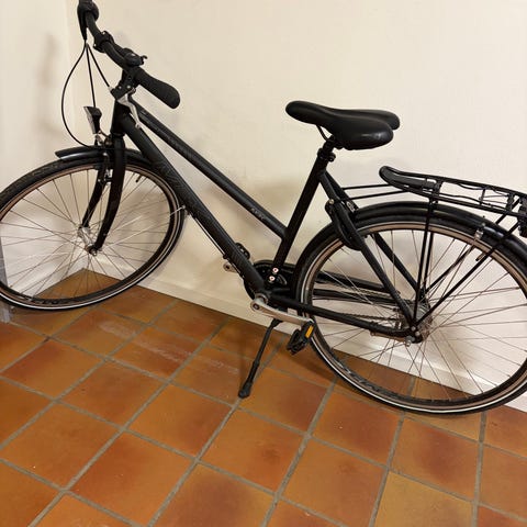 MBK bycykel til kvinder i sort farve. Cyklen har en lav indstigning, hvilket gør den nem at komme af og på. Udstyret med bagagebærer, skærme og dynamo for- og baglygte, inkl. Lås, 7 gear. Passer til daglig transport og bykørsel.