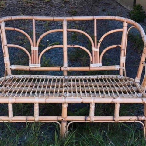 Skønt retro-sæt til gårdhaven, kolonien eller altanen: bestående af lille to-personers sofa, stol og bord med glasplade. Sættet er fra 60’erne og de originale hynder følger med. Trænger til en kærlig lak-hånd. Mål/sofa: L: ca 1 m, B: 58 cm, siddehøjde: 42 cm. Stol: B: 54 cm. Bord: H: ca 50, diameter: 34 cm.