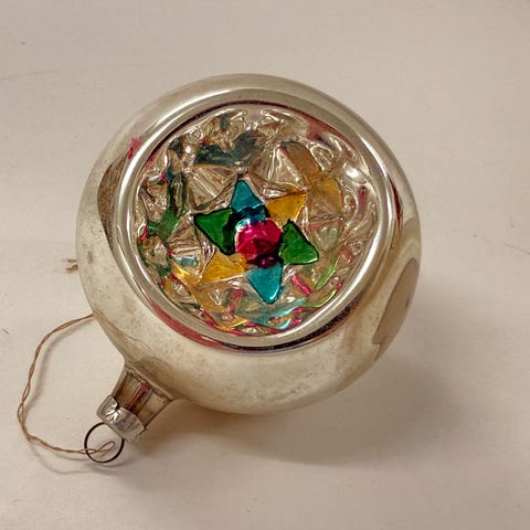 Flot juletræskugle med reflektor i sølv. Den fremstår i flot stand; hel, med smuk patina. Jeg sender gerne godt indpakket mod betaling af porto kr. 50.