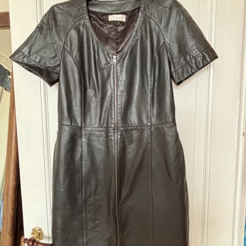 Kjole i størrelse S med sort farve. Kjolen kombinerer kunstlæder foran med strikmateriale på ærmer og ryg.