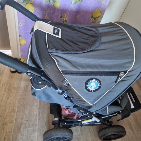 Emmaljunga barnevogn i gråt stof med klassisk design. Barnevognen har en rummelig liggedel, justerbart kaleche og et solidt stel med store hjul, der sikrer god stabilitet og komfort under brug. Velegnet til spædbørn og små børn.
