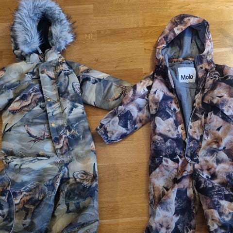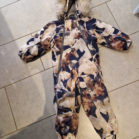 Brugt af ét barn. Har meget få brugsspor. Pelskanten er ubrugt og følger med helt ny. Der er lidt let slid på reflekslinjerne (de lyse striber) og der er en enkelt uoriginal fodstrop på men ellers er den i rigtig god stand. Den har åndbarhed og vandsøjletryk på 15.000. Modellen hedder Polaris og farven hedder “Dino forest”.