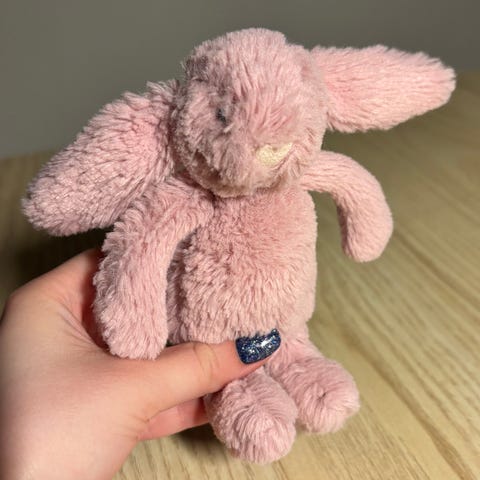 Den er brugt en del, men stadig dejlig blød. Der er mest slid på halen. Jeg har puttet lidt nyt, allergivenligt fyld i poterne/benene (de har stadig kugler i spidsen af poterne). 🤍
