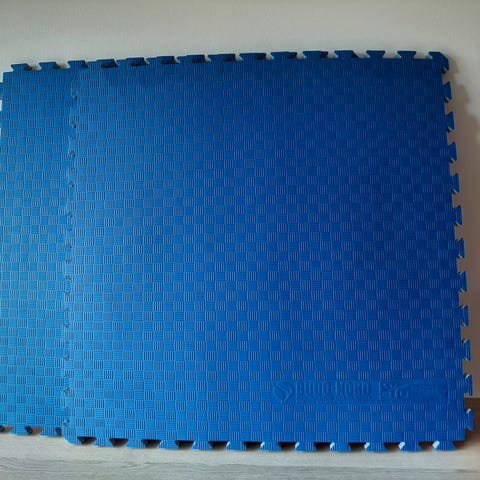 BUDO-NORD Gulvbeskyttelse Puslespil Mat i blå og rød farve. Består af sammenføjbare skumplader med mønsteroverflade, der kan bruges til gulvbeskyttelse i forskellige miljøer. Pladerne er designet til at kunne samles til større overflader og er velegnede til legeplads for børn eller trænings- og arbejdsområder.
