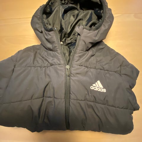 Adidas vinterjakke med aftagelig hætte med trykknapper og to lommer foran. Brun med blåt foer. Afhentes i Lyngby. Tager MobilePay.