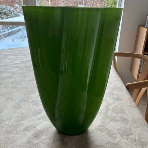 Her er den smukkeste vase af krystalglas. Den er navngivet Gardenia og designet af Anja Kjær i 1990 og blev lavet på Holmegaard Glasværk for Royal Copenhagen. Den er lavet i flere størrelser og farver, her er det den store størrelse på 23 x 17 x 12,5 cm i flagskibsfarven blå. Designet er udgået af produktion og blevet et eftertragtet samlerobjekt. Den fremstår i flotteste stand med falmet “Royal Copenhagen” mærkat på den ene side. Kr 895,-