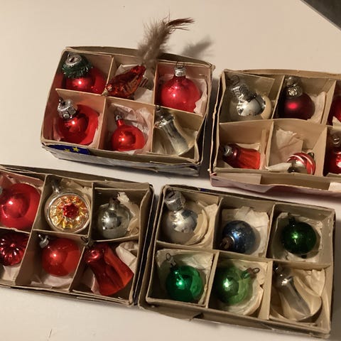 De smukkeste vintage og antikke julekugler i mindre størrelse, perfekt til det lille træ eller til en troldegren. , Flot julepynt i guld, grøn, blå og turkis nuancer. Disse glaskugler er alle temmelig gamle. Man må forvente aldersrelaterede brugsspor på delene og æskerne følger ikke med. Der er nogle helt specielle ornamenter imellem.