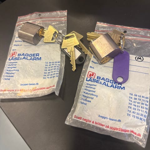 Ruko cylinderlåse med tilhørende 3 nøgler. Låsene er fremstillet i metal og designet til sikker låsning.