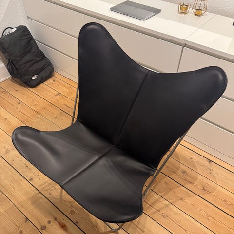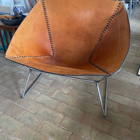 Solid stol, der dog fremstår med patina. Særligt på sædet er der lidt rifter og let misfarvning i læderet (se fotos) - kan evt udbedres med læderrens.
