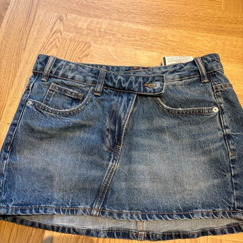 Zara denim nederdel i blå farve, størrelse 32. Fremstillet i denimmateriale, designet til kvinder. Nederdelen har lommer og syninger, der fremhæver det klassiske jeanslook.
