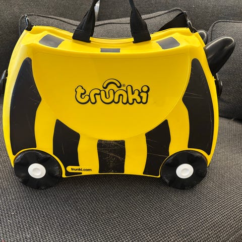 Trunki Fireman Ride-On Kuffert i rød farve med sort håndtag og blå detaljer. Tasken har hjul og er designet som en brandbil med nummer 28. Den er lavet af holdbart materiale og har indvendige stropper til fastgørelse af indhold. Egnet til børn til brug som rejsetaske eller legetøj.