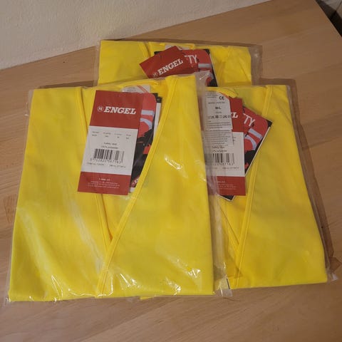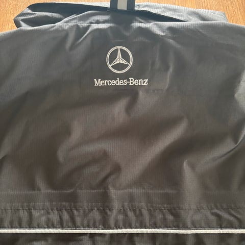 Vesten, som aldrig har været brugt, er orange og rigeligt forsynet med grå refleksbånd. På ryggen er der Mercedes logo og påskriften Mercedes-Benz, som der også er på den medfølgende opbevaringspose.
