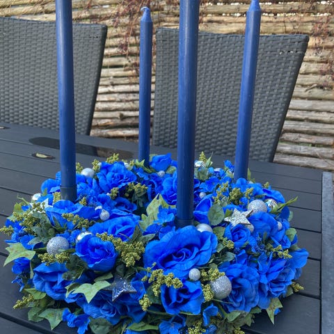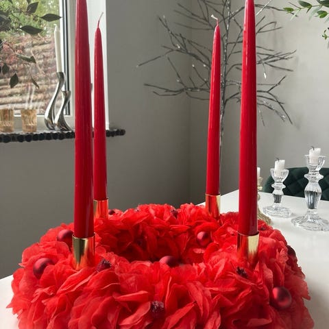 Adventskrans lavet af kunstige rosenblade i hvid/guld, så den kan bruges i flere år. Lysene sidder i lysholder, så man nemt kan skifte lysene.
