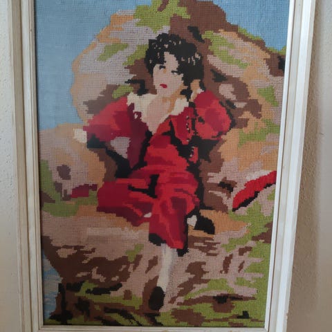 Fløjelsdreng, broderi, Gl. broderi med rød fløjelsdreng. Korssteng.