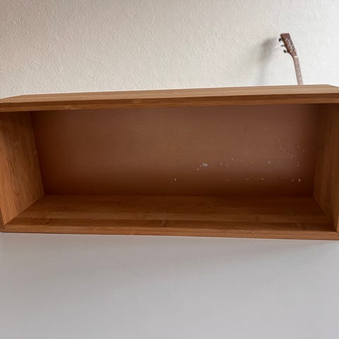 To elegante bambushylder perfekt til badeværelset! Oprindeligt var hylder med tre knager og lukket i sit udtryk (se anden annonce), men er skåret af og fungerer nu som to hylder med et enkelt udtryk.