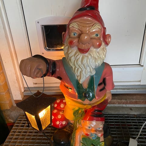 Stor gammel udstillingsnisse fra 50-60erne. Har fået oplyst af den jeg har købt den af for mange år siden at Nissen har siddet i et udstillingsvindue i Dalls Varehus i 50 - 60erne. nissen er godt brugt og noget falmet men ellers i god stand,(se de mange billeder) nissens hoved er lavet af keramik eller noget der ligner + kroppen det samme, højden når den sidder er ca 36-37 cm hele længden er ca 60-63 cm. 3400 kr eller et godt bud.