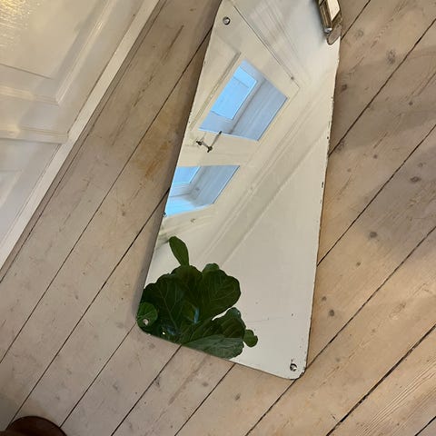 Meget smukt retro spejl med farvet små glas i en jern ramme. Det ene lille glas er revnet.
