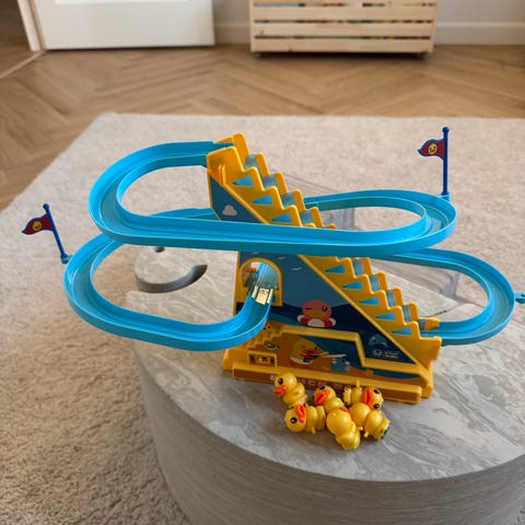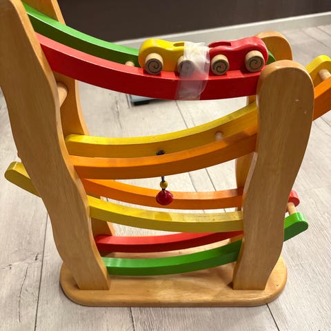 Ty Legetøj Bilbane med rutsjebane og rampe i flere farver. Legetøjet har et parkeringsområde, spiralrutsjebane og en rampe til biler. Materialet er robust plastik, velegnet til børn til leg og udvikling af motoriske færdigheder.