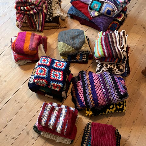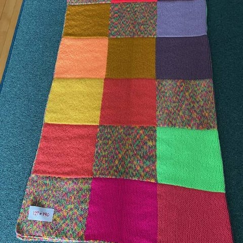 Fint hjemmestrikket tæppe, plaid, hyggetæppe.